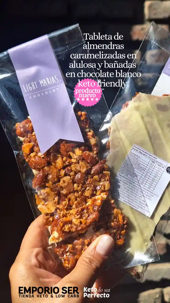 Tableta de almendras caramelizadas con alulosa bañadas en chocolate blanco keto friendly. (Bolsa 70gr) Libres de: * azúcar * soya * harinas refinadas * huevo Producto Keto Sugerencias: - Mantener refrigerado