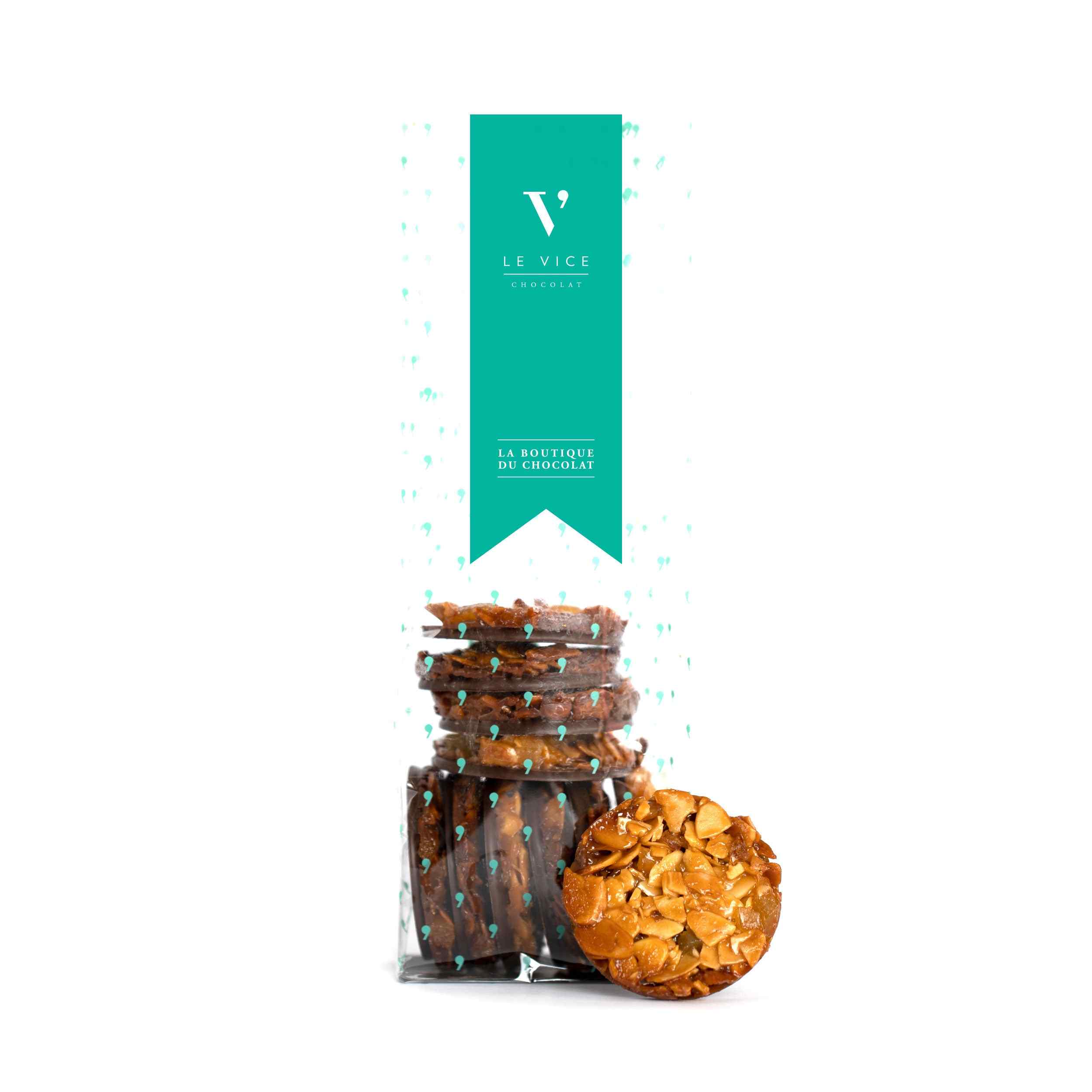 Con sus origenes en Florencia, Italia, esta espectacular galleta que hoy es conocida como parte de la cocina francesa es un placer imperdible. Semicubierta en chocolate, nuestra única mezcla de almendras caramelizadas con notas de miel, naranja y jengibre hacen de esta galleta un producto sin precedentes.