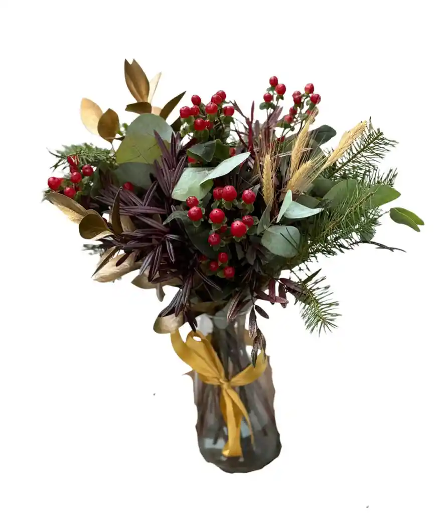 Un florero lleno de encanto festivo, compuesto por follajes naturales, hipericum y espigas.
