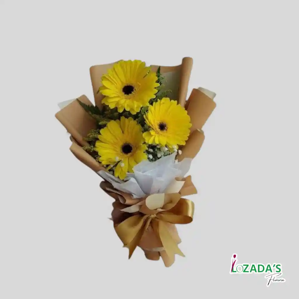Este ramo incluye 3 gerberas amarillas con gypsophila y verdes seleccionados, envuelta en fino papel coreano.