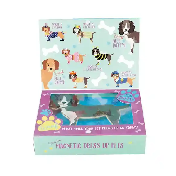 ¡Las Mascotas También Pueden Jugar a Disfrazarse! Con Este Juego Podrás Ser Estilista de Estos Dos Perritos de Madera, Vistiéndolos Como Quieras Con 7 Tenidas Distintas. Cada Pieza es Magnética Para Ser Puesta Fácilmente. Tamaño de la Caja: 5,5 x 22,5 x 16,5 cm Tamaño de Los Perros: 14,5 x 17,5 x 0,5 cm