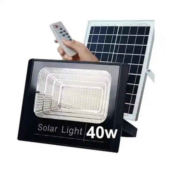 Funciona con energía solar, es resistente a la intemperie, sirve para iluminación y seguridad. El paquete incluye: -1 x Proyector -1 x panel solar -1 x control remoto Potencia Proyector: 40W Temperatura de Color: 6500K Dimensiones del panel: 300*180MM Dimensiones proyector: 200*250*70MM Tiempo de Carga: ≥3-5-8 Horas Vida útil: 25000H Material: Aluminio Resistente al Agua: IP65 Potencia Panel Solar: 15W Control Remoto: Ajuste de hora, Control de la luz, Brillo completo y modo de brillo medio Importante: El brillo depende de cuánto se cargue bajo el sol durante el día.