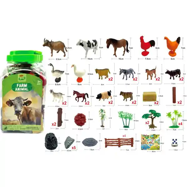 Este conjunto de modelos de animales de granja tiene 51 pcs. Diferentes modelos de incluyen cerdos, perros, ovejas, caballos, etc. y complementos como árboles, piedras y otros. Todos ellos son muy hermosos hechos con forma real, pueden ser un gran juguete para los, o como modelo de pantalla, también una gran decoración en la habitación. Medidas: 22x14cm frasco