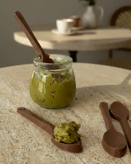 Esto es una maravilla!! Son 100 Gramos del relleno de pistacho. Si, el mismo de la famosa Barra de pistacho viral. ¿Qué tiene? Pistacho 100% real. No es una crema procesada, lo hacemos nosotras! Knafe. masa filo árabe tostada con mantequilla Simple, Crujiente, Único.