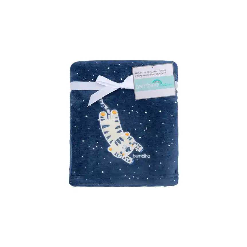 Frazada Bordada Azul Tigre Bambino. Frazada suave y ligera, ideal para llevar en tu bolso o para el paseo diario. Tu bebé se sentirá suavecito y calientito en cualquier lugar. Características: Tu bebé se sentirá suavecito y calientito en cualquier lugar. 100% Poliéster. Medidas: 100 x 76 cm. Marca: Bambino.