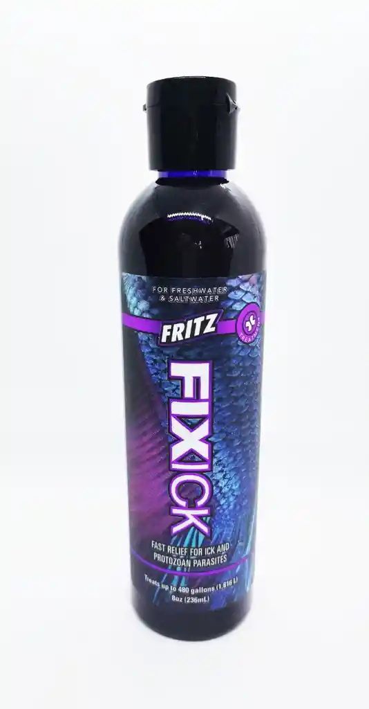 Fritz FixIck es una nueva y revolucionaria forma de tratar los parásitos acuáticos externos, incluidos Ick, Chilodonella, Trichodina y Tetrahymena. Como una de las enfermedades más comunes que encontrarán la mayoría de los acuaristas, encontrar un tratamiento Ick que sea simple, seguro y altamente efectivo puede ser difícil. Fritz FixIck no contiene formaldehído, un activo común en muchos tratamientos de ick. El formaldehído dañará las branquias y los órganos internos, lo que puede resultar en estrés adicional y pérdida de peces. Uno de los ingredientes activos de Fritz FixIck es la violeta de genciana, que le da un tono púrpura reconocible. Este compuesto es mucho más suave que los tratamientos a base de verde malaquita. También mejorando los tratamientos anteriores, Fritz FixIck ha demostrado ser eficaz para matar los parásitos Ick con un sistema simple de dosis rápida, sin reinfección después de una semana. FixIck no se recomienda en sistemas con invertebrados de agua dulce, salada o coral.