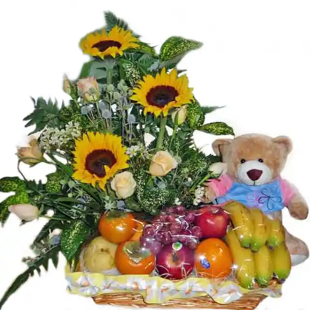 Espectacular Cesta en una selección de frutas de temporada, girasoles y peluche.