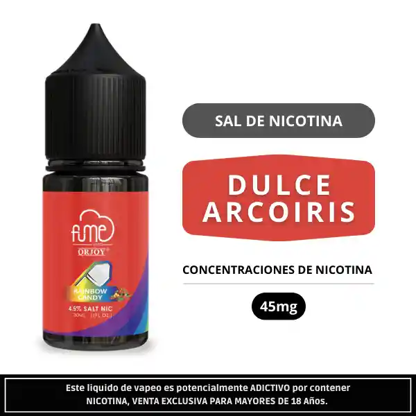 Fume Salt Rainbow Candy 30ml mezcla caramelos frutales dulces y vibrantes para un sabor colorido, brillante y muy agradable. Con 45mg/ml (4.5%) de nicotina salina y base 50/50 VG/PG, entrega caladas suaves y excelente rendimiento en pods MTL.