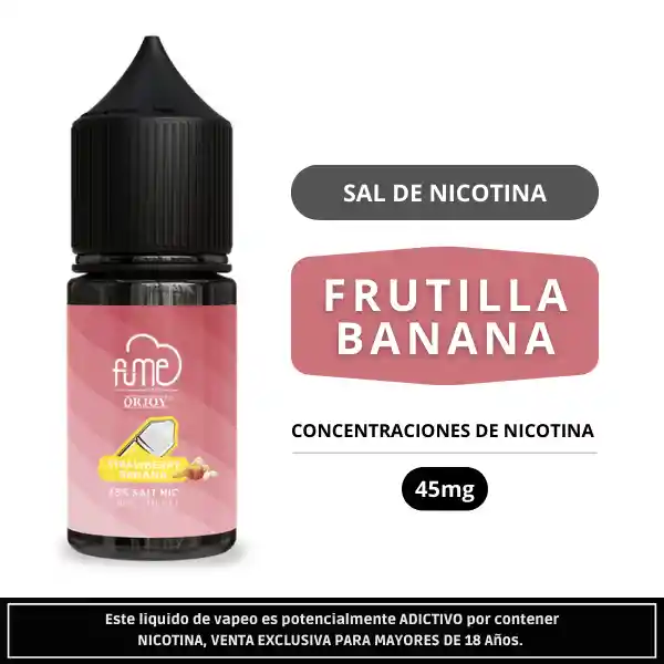 Fume Salt Strawberry Banana 30ml combina frutilla madura con plátano cremoso para un sabor dulce, suave y envolvente. Con 45mg/ml (4.5%) de nicotina salina y base 50/50 VG/PG, entrega golpes equilibrados y excelente rendimiento en pods MTL.