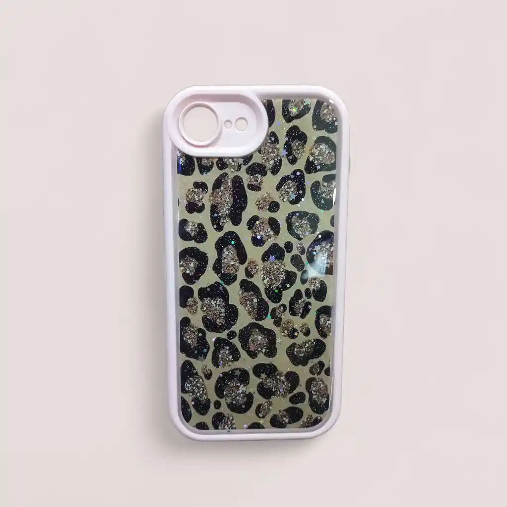 Funda con estampado de leopardo brillante y borde blanco. Material flexible, resistente y de excelente ajuste.
