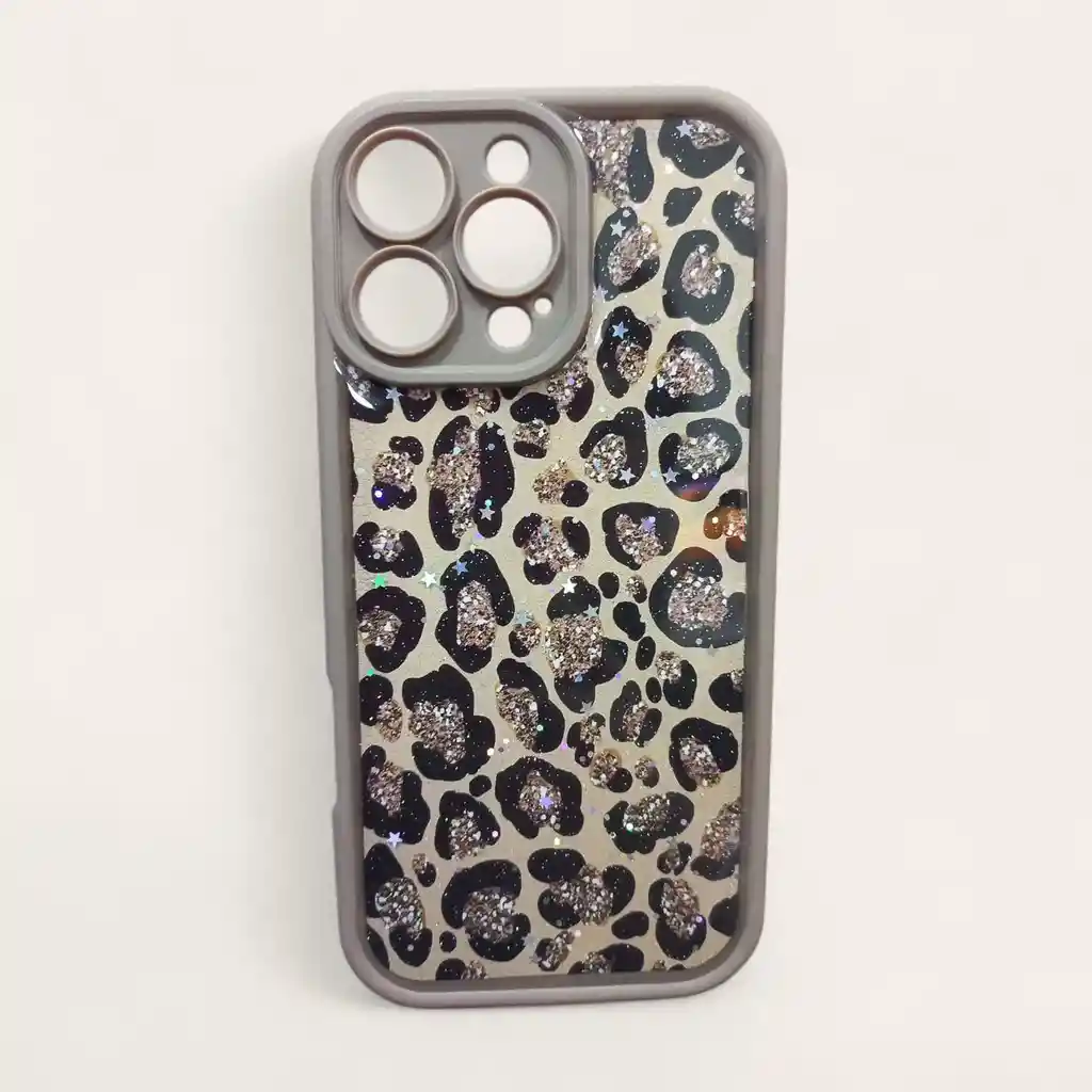Funda rígida con estampado de leopardo brillante y acabado glitter. Estructura de TPU + policarbonato, resistente a golpes y rayaduras.