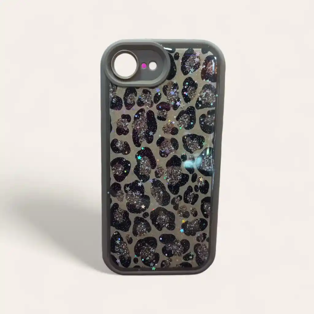 Funda con diseño de leopardo brillante y borde café. Estructura flexible, resistente a caídas leves y rayaduras.