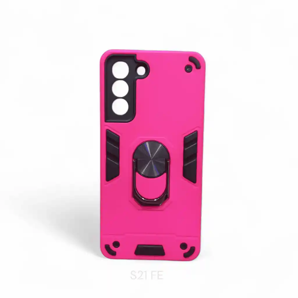 Funda tipo armadura color fucsia con anillo metálico giratorio, protección reforzada y soporte para uso manos libres.