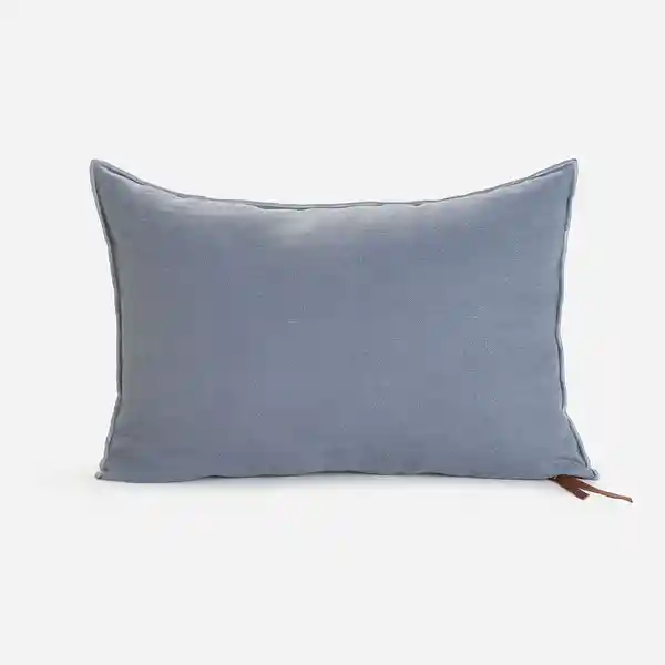 Funda de Cojín de Diseño Elegante Color Azul y Textura Suave al Ser 100% de Lino. Posee Cierre de Bronce y Tirador de Cuero.