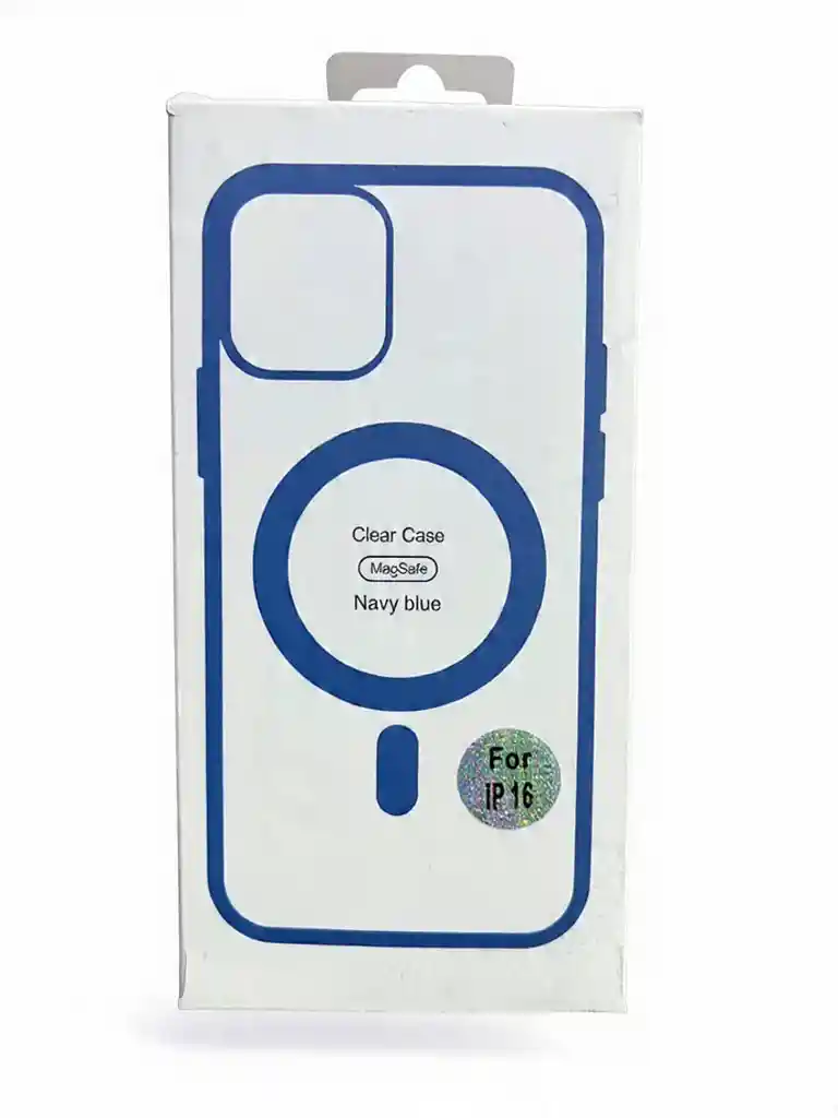 Funda transparente con borde azul metálico y anillo magnético integrado. Compatible con MagSafe, ofrece sujeción firme y carga inalámbrica rápida.