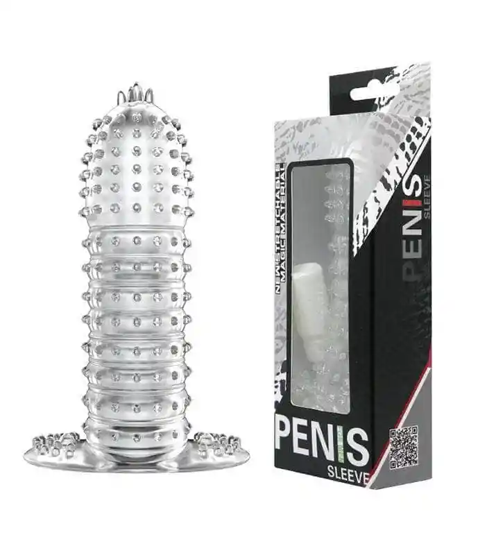Funda texturizada peneana, de silicona transparente, adaptable a cualquier tamaño.