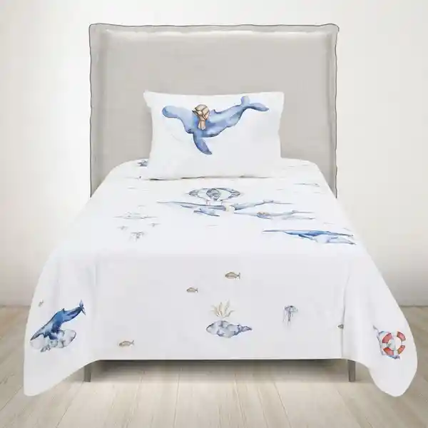 Esta Funda de Plumón Con Estampados de Ballenas Fue Ilustrada Por la Creadora Chilena María Jesús Delfau y Realizada Con la Técnica de Acuarela. También Cuenta Con un Envase Para Guardar Que Tiene Los Mismos Print y Que Puede Utilizarse Para Guardar Otros Objetos. Un Plumón Que Además es Reversible e Ideal Para Estimular la Imaginación de Los Niños y Niñas y el Amor Por Sus Espacios. Medidas: Funda de Plumón: 180 x 240 cm / Funda de Almohada: 50 x 70 cm