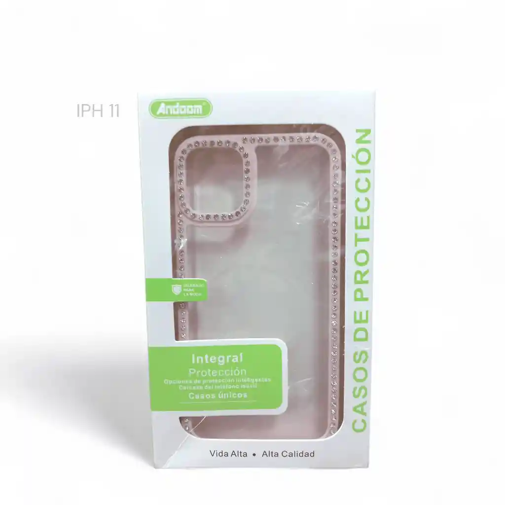 Funda transparente con bordes brillantes y strass, diseño elegante que protege contra golpes y rayones sin ocultar el color original del equipo.