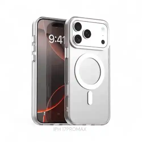 Funda protectora transparente para iPhone 17 Pro Max con soporte MagSafe integrado y material flexible de alta resistencia contra golpes y rayones.