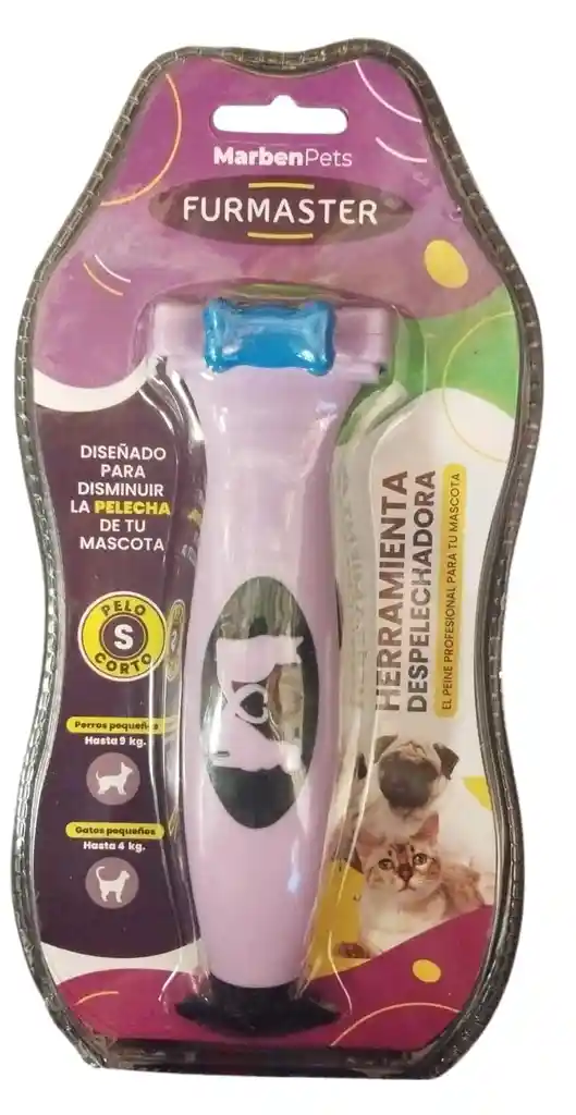 FURMASTER-Herramienta despelechadora para gatos y perros pequeños pelo Corto hasta 4 kg. Unidad Furmaster S Pelo Corto es una herramienta despelechadora, diseñada para reducir la pelecha de su mascota, recomendados para la eliminación todo el pelo muerto del pelaje de tu mascota. La ergonomía de tu herramienta despelechadora es importante si deseas cepillar de manera cómoda y rápida. Esta ergonomía la encontrarás en el mango del cepillo Furmaster S Pelo Corto siendo resistente, cómodo de agarrar y antideslizante para un correcto agarre del mismo. Con este cepillo puedes peinar a tu mascota, sin llegar a incomodarlo al realizar el proceso, ya que las púas tienen un diseño especial para no causar molestias, siendo de acero inoxidable, recuerda que es super importante realizar un buen cepillado, capaz de eliminar los pelos muertos, activar el crecimiento del nuevo pelaje y producir bienestar a nuestros amigos peludos. Características: • Cuenta con un Boton Eyector de pelo, que limpia y remueve lo pelos de la herramienta con facilidad • Mango Antideslizante, hace que la herramienta sea fácil de agarrar • Borde de acero Inoxidable, para el pelo corto que llega a lo profundo de la capa superior del pelaje eliminando de manera segura la primera capa y el pelo suelto. • Recomendado para gatitos de hasta 4 Kilogramos. • Especial para pelaje corto