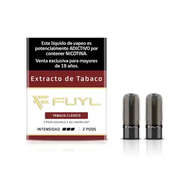 FUYL Extracto de Tabaco Clásico (Pack 2 Pods): tabaco tradicional, seco y balanceado, con sutiles matices tostados. Intensidad media–alta. Incluye 2 pods del mismo sabor (18 mg) sistema cerrado, compatible con dispositivos FUYL. Rendimiento aprox.: 2 × 30 cigarros (según uso).
