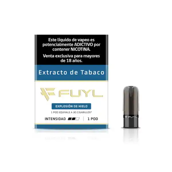 FUYL Extracto de Tabaco Explosión de Hielo : mentol fresco y vibrante sobre base de tabaco limpio para una sensación ligera y ultra refrescante. Intensidad baja. 1 Pod (18 mg) sistema cerrado, compatible con dispositivos FUYL. Rinde aprox. 30 cigarros (según uso).
