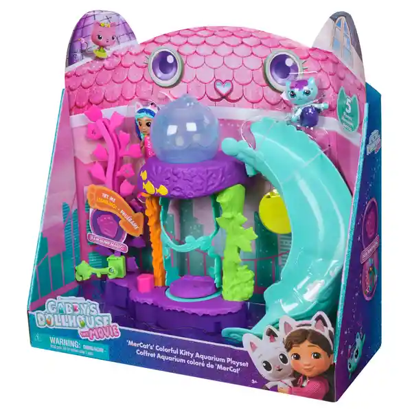 Sumérgete en el Mágico Mundo de la Casa de Muñecas de Gabby: La Película Con el Colorido Acuario Gatito de Mercat. Este Encantador Juego Incluye Cuatro Áreas de Juego Únicas Para Que Los Niños Exploren Como Una Burbuja de Plástico Transparente Con Tapa Desmontable Para Esconderse y Descubrir Además de Adorables Accesorios. Gira Los Peces y Corales Alrededor de Gabby en la Plataforma Usando el Botón Paw Bump Magic y Deja Que Gabby Suba al Elevador de Algas.