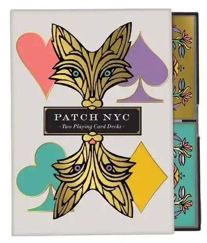 Los diseñadores de Patch NYC, Don Carney y John Ross, son conocidos por su atención a los detalles intrincados inspirados en los hallazgos del mercado de pulgas, combinados con una paleta de colores inesperados y detalles en lámina dorada. El juego de naipes Patch NYC de Galison presenta su estilo característico de ilustraciones de animales además de un colorido patrón similar a una joya en 2 barajas de naipes estándar empaquetadas en una caja de recuerdos estilo cajón. Incluye 2 barajas de cartas. 52 cartas más dos comodines cada una. Arte único en todo, caja interior/exterior estampada con lámina, caja interior para cada cubierta. Tamaño de la caja de cubierta: 2,75 x 3,75", 70 x 95 mm, tamaño de la caja del cajón: 5,75 x 4,25 x 1,25", 150 x 110 x 30 mm. Artista: Patch NYC