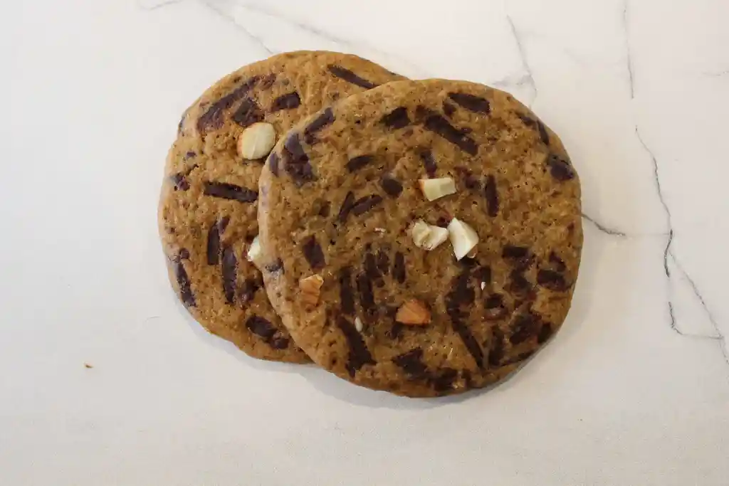 Galleta American Style sin azúcar hecha con harina integral, trozos de chocolate y almendras partidas.