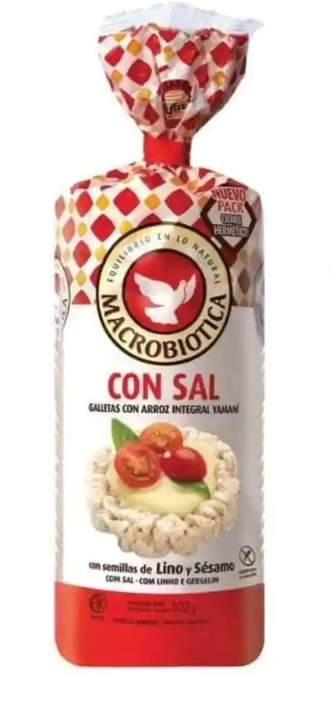 Galleta con Arroz Integral Yamani Macrobiótica con Sal, x 102 grs. Con Arroz Integral Yamani, semillas de sésamo y lino con sal, libre de gluten.