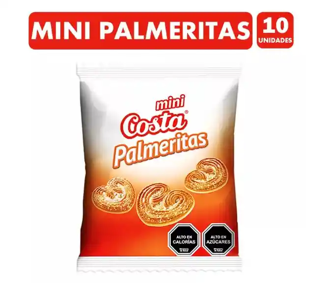 Deliciosas galletas Mini Palmeritas marca Costa. Estas crujientes y exquisitas galletas son las favoritas de todos y un clásico chileno. Este formato contiene 10 paquetes de galletas de 40 grs. cada uno y su envoltura mantiene todo su sabor y frescura y las hace ideales para llevarlas a donde tú quieras, como al trabajo o para la colación. Este clásico de clásicos podrás compartirlo con tus amigos o familia y tener un grato momento, sobre todo con los amantes de los dulces. Todos nuestros productos tienen una frescura inigualable ya que renovamos constantemente nuestro stock. Además, cuentan con envasado y sellado de fábrica que permiten conservar el producto fresco e ideal para tu consumo.