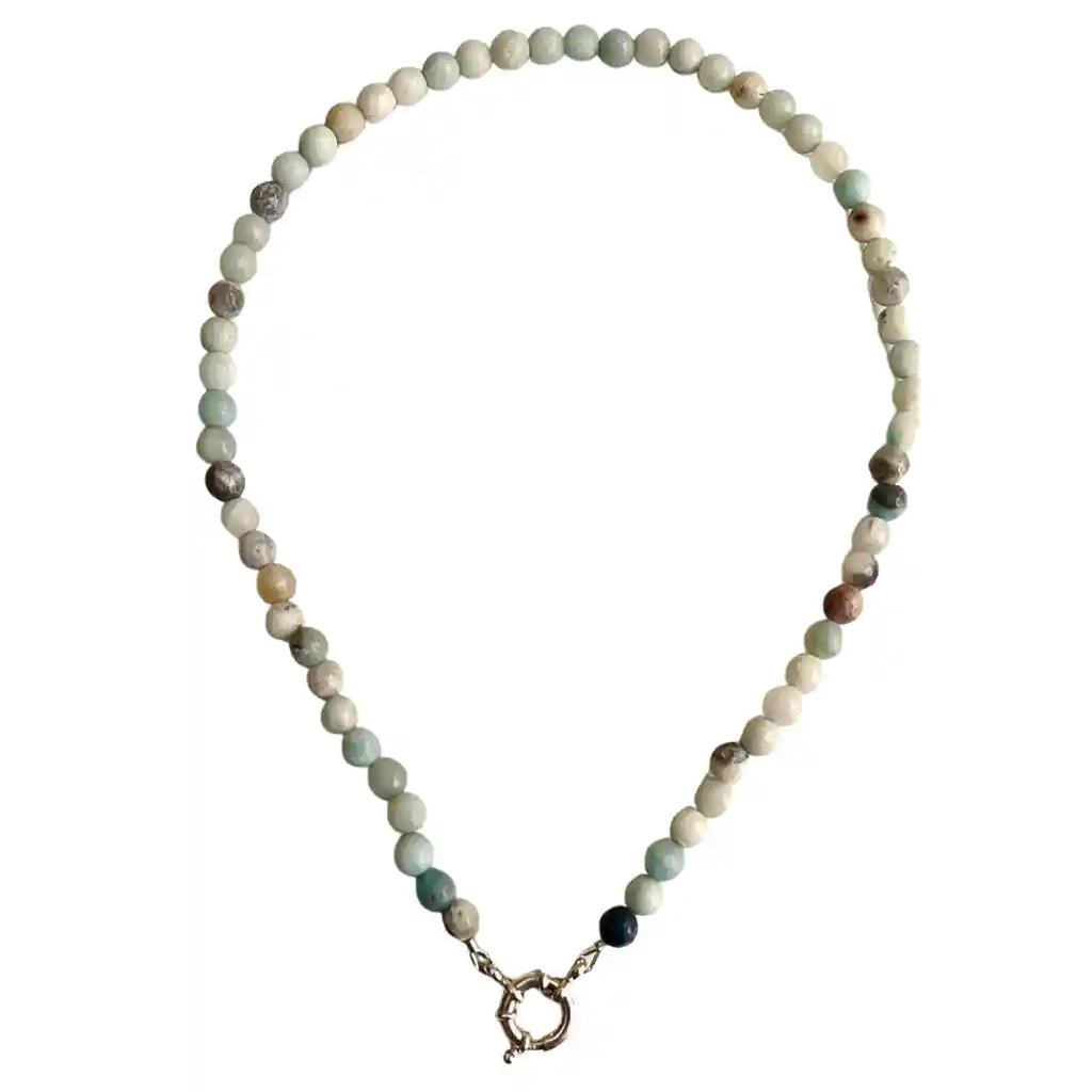 La amazonita es conocida como la piedra de la armonía y la claridad interior. Este collar de la colección Terranova está diseñado para quienes buscan una joya natural que inspire calma, equilibrio emocional y comunicación sincera. Su tono verde azulado recuerda el color del agua en movimiento, evocando serenidad y conexión con la naturaleza. 🌿💧 Desde tiempos antiguos, la amazonita ha sido considerada una piedra de protección y energía positiva, capaz de transformar la ansiedad en confianza y la confusión en serenidad. Ayuda a alinear la mente y el corazón, facilitando la expresión de emociones y la toma de decisiones desde la calma. En el plano espiritual, se asocia con el chakra garganta y el chakra corazón, equilibrando la comunicación emocional. Astrológicamente, se relaciona con Virgo, Acuario y Piscis, potenciando su sensibilidad y conexión emocional. Cada piedra de amazonita natural de esta gargantilla ha sido seleccionada y pulida cuidadosamente, mostrando leves matices entre verde, celeste y beige —una variación única que refleja la autenticidad de la piedra—. El diseño se completa con un elegante cierre tipo timón en plata 925, símbolo de dirección y control interior. ✨ Características 🌿 Piedra: amazonita natural de 6 mm (piedras pulidas y redondeadas). 💎 Metal: cierre tipo timón en plata 925 (12 mm de diámetro externo). 📏 Medidas: largo entre 40 y 42 cm aproximadamente. ⚖️ Hecho a mano: cada pieza presenta leves variaciones de tono, propias de la amazonita natural. ✨ Estilo: gargantilla de piedras naturales, elegante y relajante. Conexión y energía El Collar Terranova de Amazonita representa tranquilidad y autoconfianza. Es una joya creada para acompañarte en los días que necesitas recordar que el equilibrio nace desde adentro. Ideal para quienes aman la energía de las piedras naturales y buscan una joya que transmita serenidad y frescura. 🎁 Presentación especial Cada joya de la colección Terranova se entrega en una hermosa presentación para regalo, ideal para sorprender o conservar como un talismán de calma y armonía. ✨ Terranova – Joyas que conectan cuerpo, alma y naturaleza. 👉 Agrega al carrito ahora y siente la energía calmante y fresca de la amazonita natural.