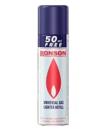 ¿Tu encendedor ya no enciende? ¡Recárgalo junto a Gas Ronson, y podrás a volver utilizarlo! El Gas butano ultra refinado de Ronson viene en un recipiente metálico, junto con una boquilla que facilitará la recarga. Especificaciones: El recipiente contiene 300ml de Gas Butano ultra refinado Ronson. El producto es exclusivamente para encendedores/sopletes que utilicen Gas Butano. Posee diversas boquillas para facilitar la recarga.