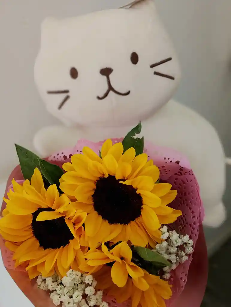 Tierno gatito de tela muy suave , para regalo nacimiento ,cumpleaños, amor Incluye : - Gatito 40 Cms - Ramo con 3 girasoles - Bolsa de regalo -Tarjetita de mensaje