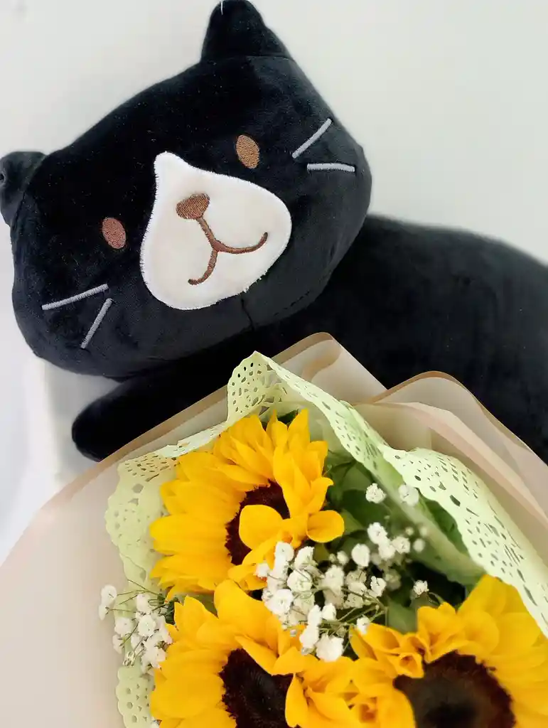 Peluche muy suave de Gato con ramo de Girasoles Incluye : - Gato de 40 Cms - Ramo con 3 Girasoles - Bolsa de regalo