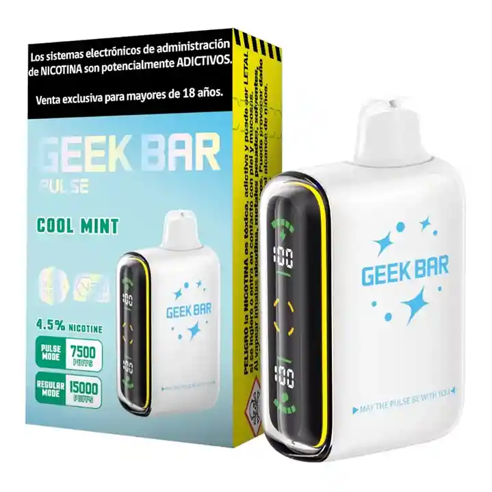 Geek Bar Pulse 15.000 Puff – Menta ICE Disfruta de una sensación ultra-refrescante con el Geek Bar Pulse Cool Mint. Este dispositivo ofrece sabor puro de menta helada, con hasta 15.000 puffs y una concentración de nicotina del 4,5 %. Características destacadas Sabor: Menta helada Puffs: Hasta 15.000 puffs Nicotina: 4,5 % (45 mg) Diseño desechable práctico, sin recargas ni mantenimiento Encendido automático por inhalación, sin botones Flujo de aire optimizado para calada suave y constante