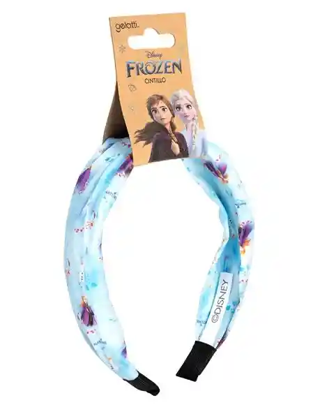 Cintillo de tela estampado Frozen en fondo color celeste suave con imágenes de Anna y Elsa. 100% Poliéster