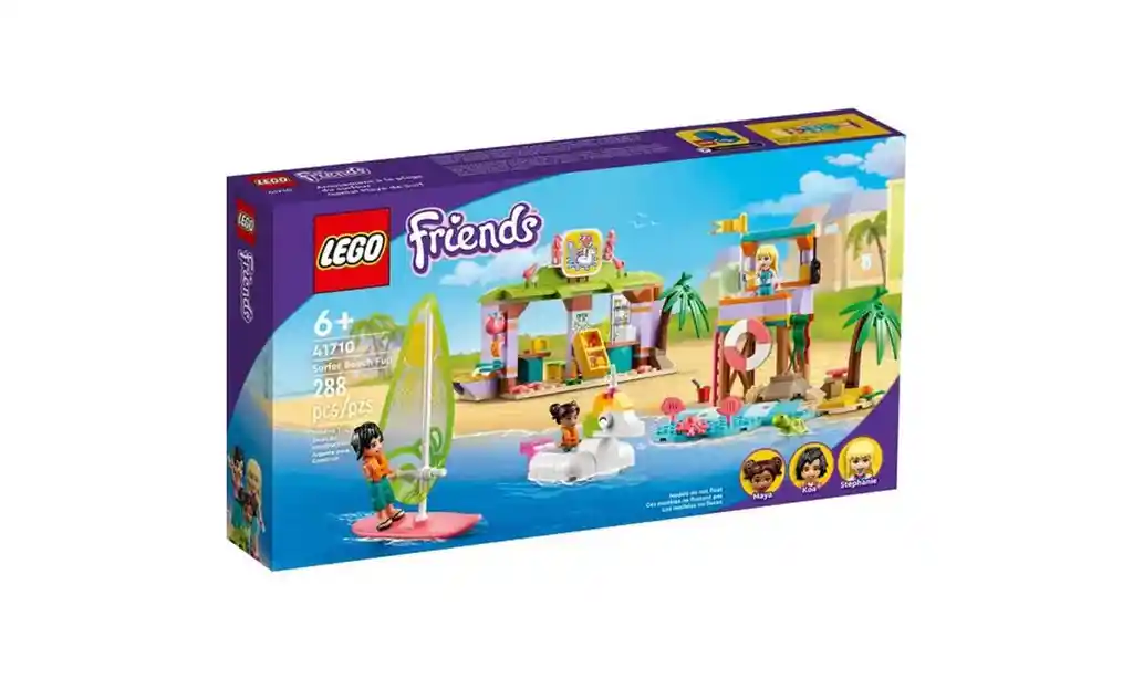 Ayuda a tu peque de 6 años o más a subirse a una gran ola de creatividad mientras explora todos los detalles y juguetes del set LEGO® Friends Genial Playa de Surf (41710). Contiene una torre de vigilancia, una escuela de surf con tienda de alquiler de equipo, una tabla de surf de juguete y un flotador con forma de unicornio, además de montones de simpáticos y creativos elementos típicos de playa. Juguetes para alimentar la imaginación Las niñas acompañarán a LEGO Friends Stephanie en su torre de socorrista y se asegurarán de que nadie corra peligro. También pueden encargarse de la escuela de surf, atender a los clientes en la tienda de alquiler de equipo, coger grandes olas en una tabla de surf, nadar en el mar con aletas y un esnórquel o disfrutar jugando en la playa con el cubo y la pala de juguete. Divertida construcción digital El set incluye una guía de construcción en imágenes e instrucciones digitales interactivas, disponibles en la app gratuita Instrucciones de Montaje LEGO. • Set de playa para peques: Las niñas mayores de 6 años que adoran los juguetes inspirados en la playa se divertirán contando creativas historias durante horas mientras juegan con el set de construcción Genial Playa de Surf (41710). • Montones de elementos para explorar: Incluye una torre de socorristas, un flotador con forma de unicornio, una tabla de windsurf, una escuela de surf con aula, ducha y tienda de alquiler de equipo, y también a LEGO® Friends Stephanie, Koa y Maya. • Muchas maneras de jugar: Las peques pueden vigilar la playa desde la torre de socorristas, usar el flotador, practicar en la tabla de windsurf, tomar clases en la escuela de surf o hacer de dependientas en la tienda de alquiler de equipo. • Un sinfín de accesorios creativos: La caja contiene un surtido de divertidos juguetes de playa, como aletas, un esnórquel, un salvavidas y una escafandra de esnórquel para que la imaginación navegue sobre una gran ola de creatividad. • Regalo para peques creativas: Este set de socorrista LEGO® Friends es genial para hacer un regalo divertido en cumpleaños, en fiestas señaladas o en plan espontáneo a niñas de 6 años o más que adoren la playa y el juego de interpretación creativo. • Dimensiones: La tienda mide aproximadamente 10 cm de altura, 15 cm de anchura y 6 cm de profundidad; la torre mide aproximadamente 12 cm de altura, 11 cm de anchura y 15 cm de profundidad. • Guía de construcción digital interactiva incluida: Con la app Instrucciones de Montaje LEGO® para smartphones y tabletas, las niñas pueden acercar, girar y ver sus modelos de juguete desde todos los ángulos mientras construyen. • La imaginación leva anclas: Descubre a tu peque los juguetes ambientados en Heartlake City, que le permitirán pasarlo genial durante horas interpretando situaciones del mundo real en compañía de héroes cotidianos. • Énfasis en la calidad: Todos los elementos y componentes creativos LEGO® cumplen estrictas normas del sector, lo que garantiza su consistencia, su compatibilidad y que proporcionen una divertida experiencia de construcción; así ha sido desde 1958. • La seguridad es lo primero: Los juguetes infantiles LEGO® se dejan caer, se calientan, se aplastan, se retuercen y se analizan para verificar que satisfacen rigurosos estándares mundiales de seguridad.