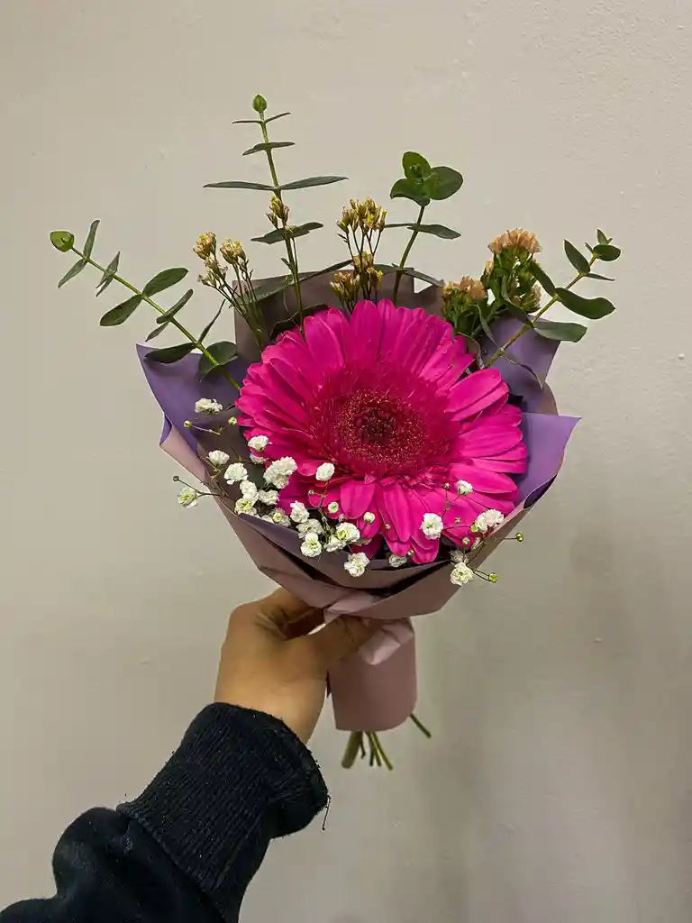 Hermosa gerbera color fucsia, acompañada de eucalipto aromático. envuelta en delicado papel color rosado-lila que la hará resaltar mas su belleza. PRODUCTO SENSIBLE