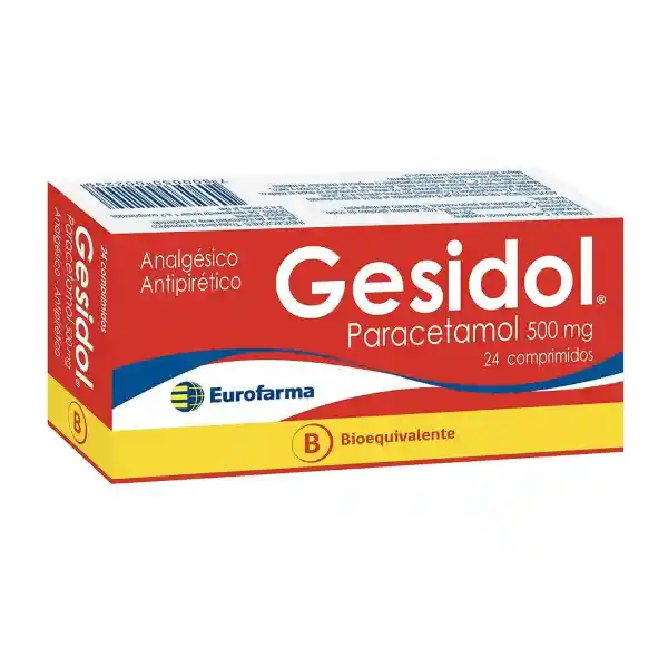 Principio Activo: Paracetamol / Forma Farmacéutica: Comprimidos / Dosis Por Forma Farmacéutica: 500 mg. ¿Para Qué Enfermedades o Condiciones se Prescribe Este Medicamento? Tratamiento Sintomático de Estados Dolorosos y Febriles. Dolor de Cabeza, Odontalgias, Dolores Musculares. Indicado en Pacientes Con Intolerancia o Alergia al AAs. ¿Cómo Debo Usar Este Producto? (Posología) el Médico Debe Indicar la Posología y el Tiempo de Tratamiento Apropiado Para su Caso Particular, no Obstante la Dosis Usual Recomendada Es: Adultos y Niños Mayores de 11 Años: 325 ó 500 mg Cada 4-6 Horas, Según Sea Necesario, Por un Máximo de 5 Días, si se Usa Para Aliviar un Dolor o 3 Días si se Usa Para Controlar la Fiebre. Si no Hay Mejoría o Aparecen Otros Síntomas, Consulte Con su Médico. No Utilizar Más de 4 g al Día. En Tratamientos Largos, la Dosis no Debe Ser Mayor de 2.6 g Diarios. Presentación (Forma Farmacéutica y Dosis) Gesidol Viene en Envase Con 24 Comprimidos de Administración Vía Oral, la Dosis es de 500 mg Por Comprimido. Condiciones de Almacenamiento Mantener en su Envase Original, Fuera Del Alcance de Los Niños, Protegido Del Calor, la Luz y la Humedad. Principio Activo (Nombre Genérico) Paracetamol. Advertencias de Uso no Administrar Por Más de 5 Días en Caso de Dolor, Por Más de 3 Días en Caso de Fiebre, o Por Más de 2 Días en Caso de Dolor de Garganta Sin Consultar al Médico. El Uso Prolongado y de Altas Dosis de Paracetamol, Puede Provocar Severo Daño Hepático. Este Producto no Debe Administrarse a Menores de 12 Años, Sin Consultar Dosis al Médico. – en Caso de Sospecha de Una Intoxicación Por la Administración de Una Mayor Dosis Que la Señalada se Puede Presentar el Siguiente Cuadro: Vómitos, Náuseas, Dolor Abdominal Superior. – en Estos Casos Debe ir a un Centro Asistencial. – en Todos Los Casos, de Sospechar Una Sobredosis Debe Consultar al Médico Aún Cuando no se Presenten Síntomas. – Ancianos: No es Necesario Modificar Las Dosis en Ancianos Sanos. – Embarazo y Lactancia: No se Han Encontrado Antecedentes de Efectos Adversos, Usar Con Autorización Del Médico. – en Enfermos Alcohólicos Dar Sólo Por Períodos Breves y Con Autorización Del Médico. Antes de Usar Este Medicamento, Consulte Con el Médico Sobre Los Siguientes Aspectos: – Alergias: Si Ud. Ha Presentado Anteriormente Alguna Reacción Alérgica a Este Medicamento o a Otras Sustancias, ya Sea Alimentos, Preservantes, Colorantes, Saborizantes u Otros Medicamentos Analgésicos. – Enfermedad Del Hígado o Del Riñón: Dar Sólo Por Períodos Breves y Con Autorización Del Médico. Paracetamol es un Medicamento Que se Encuentra Solo o en Combinación Con Otros Principios Activos, en Productos Destinados al Tratamiento de Resfrío, Tos, Alergia, Entre Otros. Algunos de Estos Productos Pueden Venderse Libremente y Otros Requieren Receta Médica. Paracetamol Puede Causar, Aunque Con Poca Frecuencia, Reacciones Graves a la Piel, Que Pueden Manifestarse Con Enrojecimiento, Erupción Cutánea, Ampollas y Daños en la Superficie de la Piel. Si Usted Desarrolla Erupción Cutánea u Otra Reacción a la Piel Mientras Usa Paracetamol, Deje de Tomarlo y Acuda al Médico Inmediatamente. Si ya ha Tenido Reacciones a la Piel Con Paracetamol, no Tome Medicamentos Que lo Contengan. Paracetamol Puede Causar, en Dosis Superiores a Las Habituales, Graves Daños al Hígado, Que se Pueden Manifestar Con Síntomas Como Fatiga Inusual, Anorexia, Náuseas y/o Vómitos, Dolor Abdominal, Ictericia (Coloración Amarilla de Piel y/o de la Zona Blanca de Los Ojos), Orina Oscura o Deposiciones Blanquecinas. En Caso de Presentar Alguno de Estos Síntomas, Suspenda el Uso Del Medicamento y Acuda al Médico. Es Importante Mantener Este Medicamento Lejos Del Alcance de Los Niños y de Personas Con Tendencias Suicidas y Acudir Por Ayuda Médica Inmediatamente si se ha Ingerido Una Cantidad Significativamente Superior a la Habitual (El Doble de la Dosis Diaria Normal o Más). Dosificación Cada Comprimido Contiene: Paracetamol (Acetaminofeno) 500 mg. Reacciones Adversas Los Medicamentos Pueden Provocar Algunos Efectos no Deseados, Además de Los Que se Pretende Obtener. Algunos de Estos Efectos Pueden Requerir Atención Médica. Consulte Inmediatamente al Médico si Presenta Alguno de Los Síntomas Siguientes: Dolor en el Estómago, Diarrea, Vómitos, Ictericia. Trastornos Sanguíneos Que se Pueden Manifestar Por Escalofríos, Fiebre, Úlceras en la Boca, Irritación de la Garganta o Bien, Debilidad y Cansancio o Hemorragias. Hepatitis (Piel y Ojos Amarillos). Falla Renal (Disminución de la Orina). Pueden Ocurrir Otros Efectos no Deseados Que Usualmente no Requieren Atención Médica y Que Desaparecen Con el Uso (Adaptación Del Organismo al Medicamento). No Obstante, si Continúan o se Intensifican, Debe Comunicarlo al Médico. Reacciones Alérgicas, Picazón y Manchas en la Piel, Malestares Estomacales. Contraindicaciones Hipersensibilidad al Paracetamol. Insuficiencia Hepática Severa, Enfermedad Hepática o Hepatitis Viral. Condición de Venta Venta Libre.