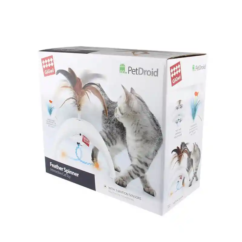 Feather Spinner de la serie Pet Droid de Gigwi es el juguete interactivo perfecto para tu gato. Este juguete está equipado con 3 sensores de movimiento sensibles que controlan la dirección de la pluma haciendo que se mueva y gire, fomentando el instinto de caza de tu felino.