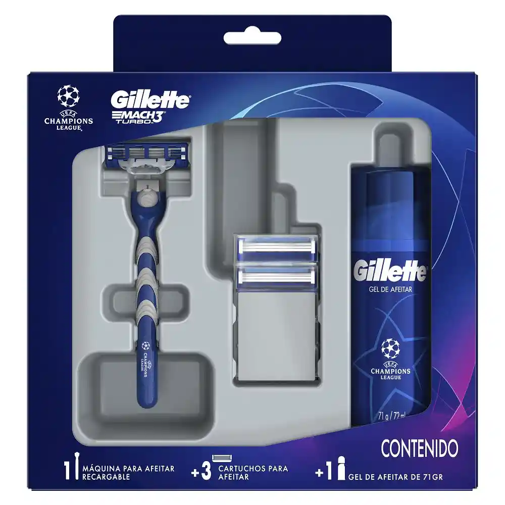 Vive la Experiencia Con Gillette Mach3 Turbo Edición Limitada Champions League. La Rasuradora Mach3 Turbo Tienen Hojas Más Afilados Para Obtener Una Rasurada Más Cómoda. Estas Hojas Están Fortalecidas Con un Revestimiento de Carbono a Nivel Atómico Que Ayuda a Mantenerlas Más Afiladas Por Más Tiempo. Las Rasuradoras Mach3 de Gillette Tienen un Protector de Piel Con 10 Tensores Flexibles Hechos de Elastómero Blando. Estos Tensores Estiran la Piel Suavemente Para Crear Una Superficie Lisa y Plana Delante de Las Cuchillas. Su Mango Ergonómico te Brinda un Excelente Control Mientras te Afeitas. Productos de Afeitada Con Licencia Oficial de la Uefa. Vs. la Desechables de 2 Cuchillas de Gillette.