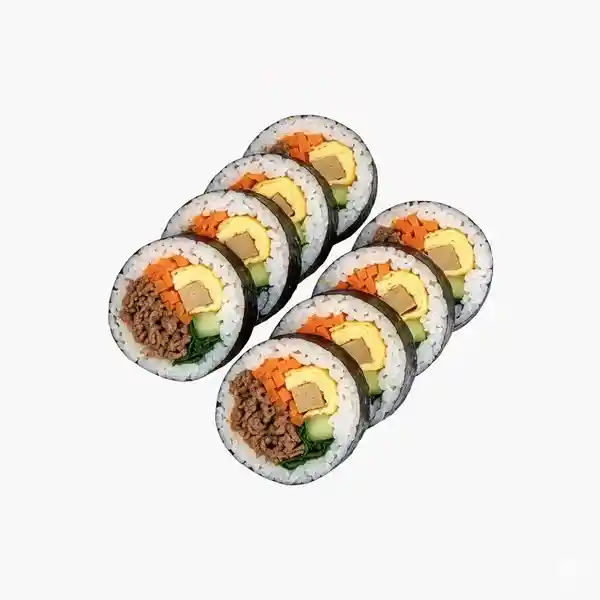 El Gimbap de Carne Bulgogi de El Mesón es una preparación tradicional coreana que combina arroz sazonado, vacuno salteado y una cuidada selección de vegetales frescos como espinaca, zanahoria, pepino y nabo encurtido. Enrollado en alga nori y cortado en porciones, ofrece un perfil de sabor suave y armonioso, ideal como comida completa o para compartir.