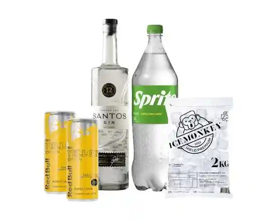 Gin Santos + 2 Red Bull Yellow + Sprite 1.5lts + Hielo 2kg