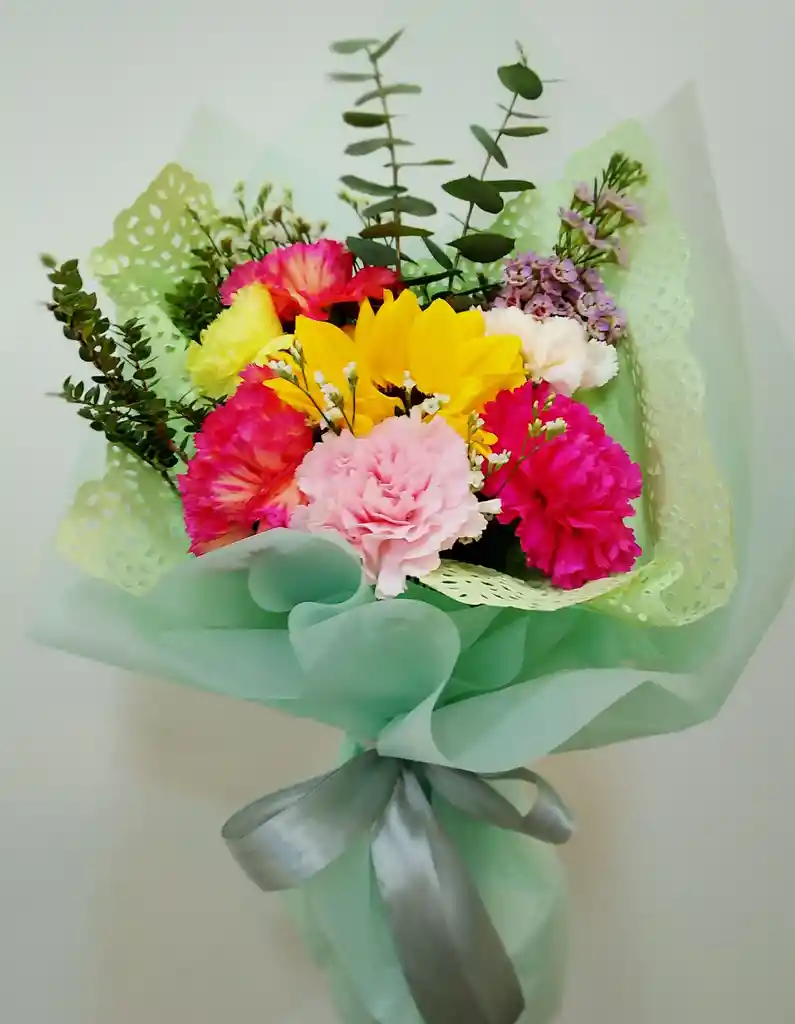 Colorido ramo para alegrar a quien lo recibe Incluye : -1 Girasol -6 Claveles importados -Follaje de estación -Tarjetita de mensaje