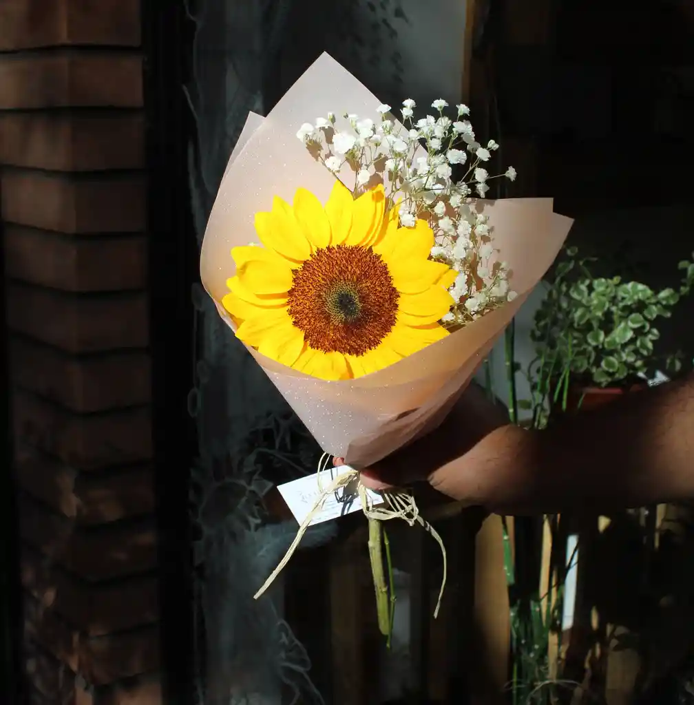 Delicado Girasol, acompañado de toques de gypsophila envuelto en papel color rosado o menta con toques de brillo.