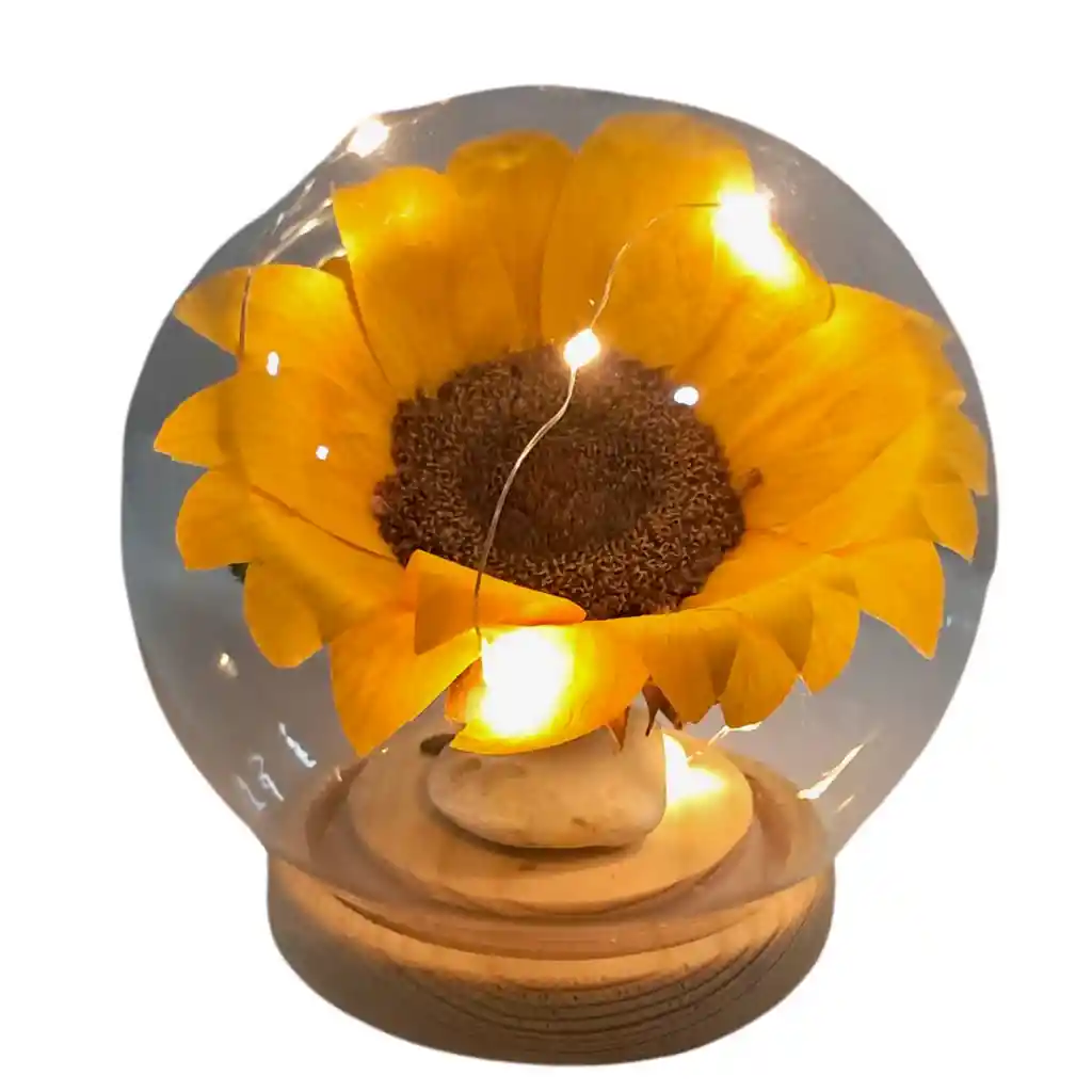 Girasol preservado en capsula con luces microled, girasol 100% natural importado de Ecuador en donde pasa por un proceso quimico que le permite permanecer en perfecto estado por 5 años aprox., viene en caja para regalar e instrucciones de cuidado.