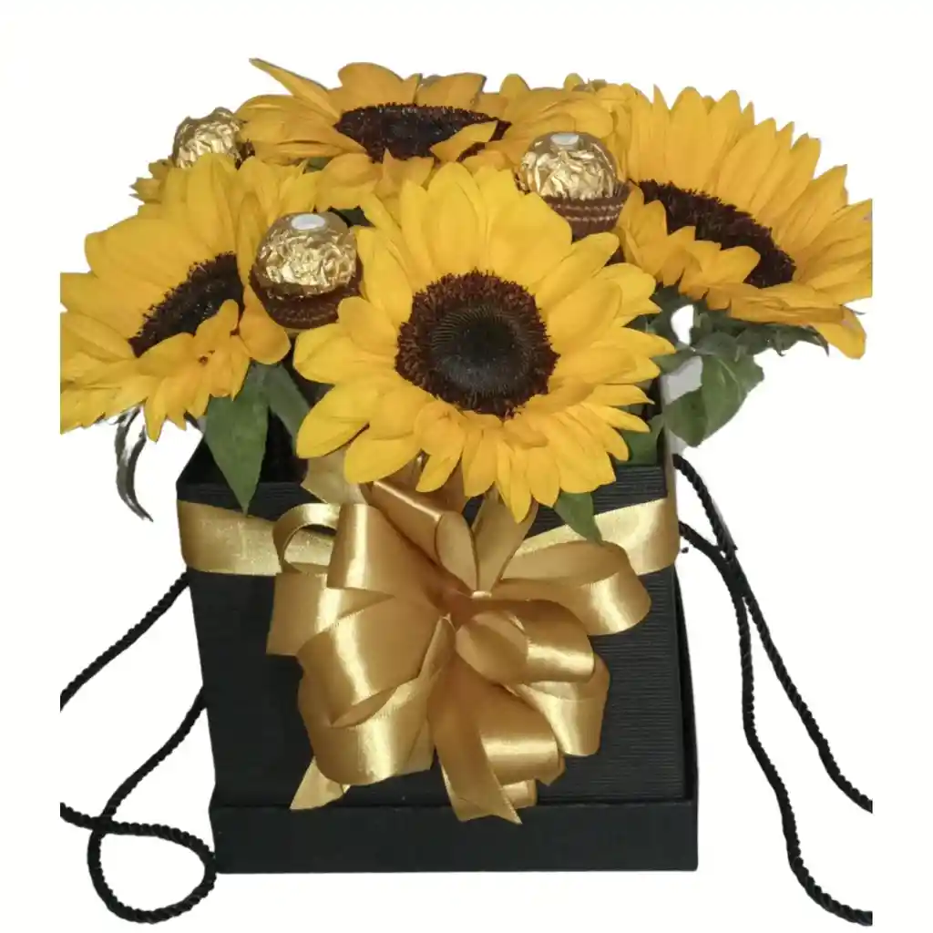 6 Girasoles en Caja mas 6 bombones Ferrero Rocher. Decorado Con cinton. Altura 22 cm Aproximadamente