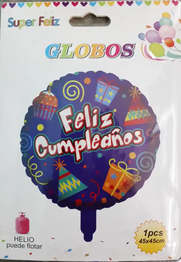 Globo metálico redondo "Feliz cumpleaños" 45x45cm. Se puede inflar con aire o helio
