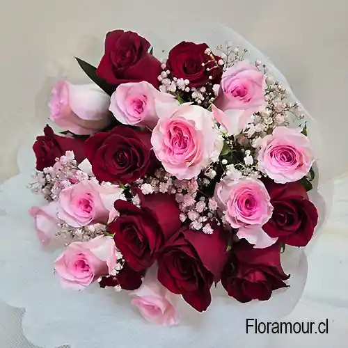 Bello ramo de 18 rosas importadas, atadas y envueltas en papel decorativo
